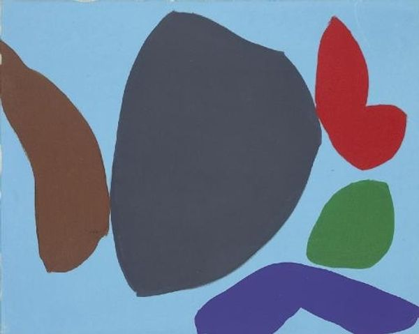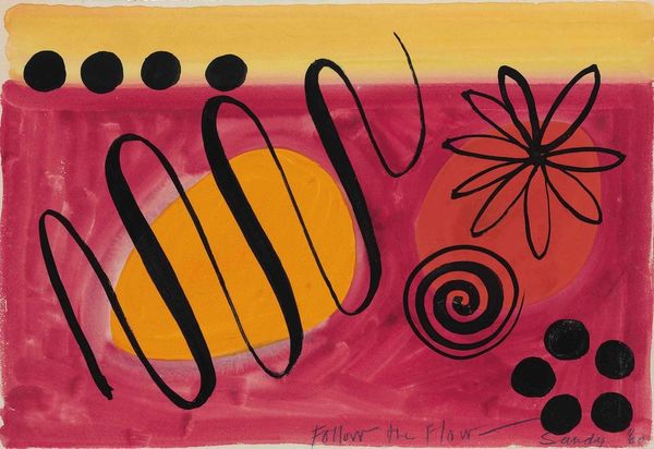 Alexander Calder created "Flower on a Yellow Ground" using gouache in 1971. At first glance, the sunny yellow backdrop offers a cheerful scene, yet look closer and notice how Calder's use of color and form complicates this initial impression. The painting balances organic and abstract elements. We see simplified leaves rendered in bold red, juxtaposed with the whimsical blue flower composed of concentric spirals. The stark contrast between the bright yellow and the other primary colors creates a dynamic tension. Calder’s playful composition invites us to question traditional representations of nature. This artwork operates through a visual language of signs. The simplified shapes act as signifiers, prompting us to decode their relationship to the natural world and to each other. The flatness of the gouache flattens the image and destabilizes any sense of depth, emphasizing the painting's constructed nature. Ultimately, Calder challenges our expectations and celebrates the power of abstraction to evoke and provoke thought.