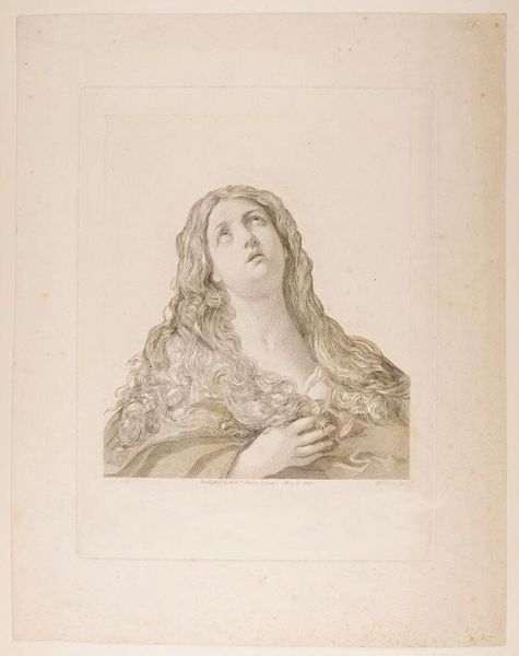 This is Bernard Picart's "Presumed Portrait of Alexander the Great," made with red chalk, and is currently held at the Metropolitan Museum of Art. Immediately, the oval composition focuses our gaze on the figure, rendered in delicate sanguine tones. The hatching technique gives form and volume to the figure, yet it also suggests a certain fragility, a transient existence captured on paper. The portrait’s presumed subject, Alexander, is presented with traditionally feminine features. This destabilizes established categories of gender and power. Picart’s choice of soft lines and warm hues invites a re-evaluation of masculinity, challenging the viewer to reconsider fixed notions of heroism and beauty. The drawing prompts us to consider how artistic representation shapes our understanding of historical figures. It reminds us that art serves as a site where cultural values are negotiated and redefined, and that even portraits can be fluid and open to reinterpretation.