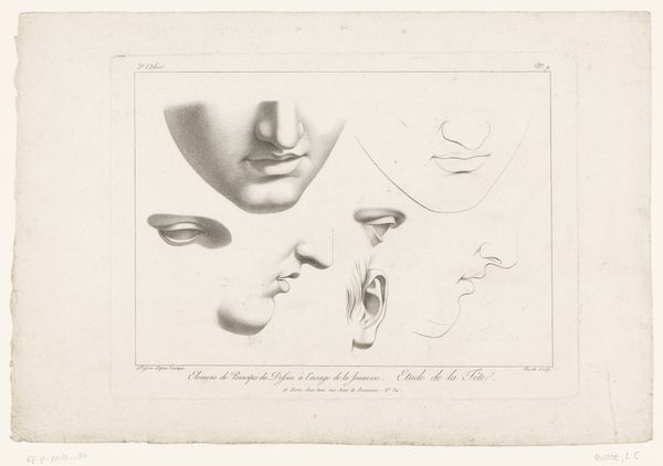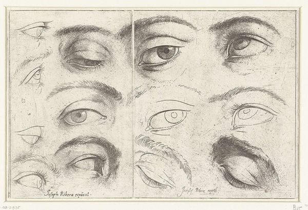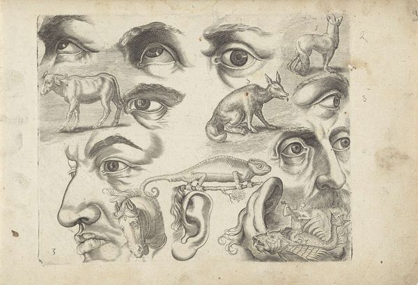 This print, made by Luca Ciamberlano, gives us a glimpse into the artist's methods through a series of studies of eyes and mouths. These isolated features, rendered with meticulous detail, echo the ancient Greek practice of studying human anatomy to capture ideal beauty. Consider the eye, often called the window to the soul; its varying expressions encapsulate a range of emotions. The study of physiognomy, popular during Ciamberlano's time, sought to link facial features to character traits. We can trace the symbolic weight of the eye back to ancient Egypt, with the Eye of Horus representing protection and royal power. In a psychoanalytic light, the eye's intense focus and capacity to reflect evokes deep, subconscious reactions. The motifs in this print illustrate art's non-linear progression, where symbols are continuously reinterpreted and adapted across cultures. As we gaze upon these fragments, we become part of a visual dialogue spanning centuries, engaging with enduring questions about human expression and identity.
