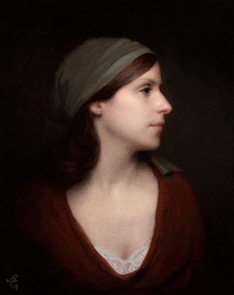 Curator: Let’s turn our attention to "The Poet" by Adrian Gottlieb, a portrait rendered in oil paint. The image presents a figure in profile. Editor: There's a contemplative stillness here, a quiet solemnity in the gaze of the subject. It almost feels like an early photograph, given that level of realism, but softened somehow. Curator: It's interesting that you pick up on the softness, I think this is definitely a painting engaging with historical portraiture, given the fine, smooth brushstrokes and rendering of light. Look closely at the way the artist has built up texture and form using delicate, almost imperceptible layers of pigment. It appears highly worked. Editor: I see so many different elements coming together. She wears a simple head covering and a fur-trimmed coat, while clutching what appears to be a small book to her chest. The way she holds that book—it suggests not just reading but almost protection, like guarding a secret. Curator: Given the artist's adherence to academic painting traditions, the book's symbolism could also speak to knowledge, inspiration, and the labor involved in producing literature or poetry itself. How were these pigments mixed, applied, and sourced? What kind of brush would deliver a line so precise, so soft? I wonder, also, about the coat--fur represents the fraught nexus of fashion and natural resources. Editor: That’s a great observation about the symbolism, but more broadly it suggests identity as a process of assemblage; we read status, class, and access in each visual element, contributing to our read of “The Poet.” This layering helps to communicate not only a personality, but perhaps something archetypal about the creative person. Curator: The way those cultural symbols speak is shaped directly by material access. Oil paint wasn't always cheap. Fur still represents luxury. To be a 'poet', even in appearance, involves resources that belie a romantic image of the solitary, starving artist. Editor: It leaves me wondering about the sitter herself—about her actual lived experience—as distinct from the symbolic 'poet'. Curator: A compelling distinction; I'm now considering what we might discover if we consider both lived labor and its aestheticized representation.