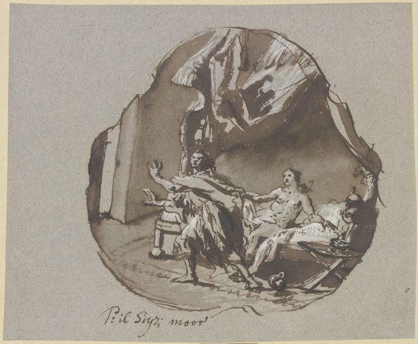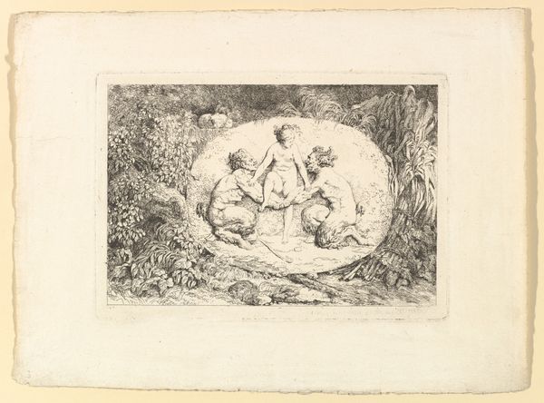 Curator: Here we have an intriguing engraving, an oval composition titled "Putto at left by a fire, another at right carrying wood, an allegory of the seasons (Winter)." It’s dated sometime between 1650 and 1680, and its origins remain anonymous. Editor: The first thing that strikes me is the cool and somber mood. The lines are finely etched, creating a delicate, almost fragile effect despite the subject's implied actions. It’s interesting how the artist achieved depth using only line work. Curator: Absolutely. Consider how this piece plays into societal and political dialogues around representations of childhood, particularly within allegorical contexts. The putti, symbols of innocence, are placed within the realities of winter – a time often associated with hardship. How do you see that reflecting broader narratives? Editor: The composition guides us, from left to right, towards an allegorical narrative. Note the shift in tone and texture between the putto adjusting his coat, presumably against the cold, and the other carrying firewood against what appears to be an artic background. Semiotically, the fire creates an interesting dialogue: a promise of warmth but also a potential hazard that could perpetuate colonial logics. Curator: A complex interplay to be sure. It speaks volumes about our relationship with the environment and our dependency on specific landscapes or cultures. The visual tension between the fire’s allure and the burden carried by the other figure really encapsulates that dynamic. And looking at it through a post-colonial lens, that connection is all the more complex. Editor: Yes, I appreciate the artist's technique for imbuing what seems a mundane activity with socio-economic resonance. Observe how they are framed: One near the warm fire, but also the same that may contribute to atmospheric warming and the other subject seemingly working and thus possibly furthering climate injustices? Curator: Viewing this image allows for consideration of our place within historical contexts, particularly how narratives surrounding innocence, labor, and seasonal change impact social structures. Editor: The piece prompts one to look for those connections and appreciate the symbolic language in which it is rendered. The artist shows us not just images but coded messages about labor and privilege that are quite relevant to ongoing conversations.