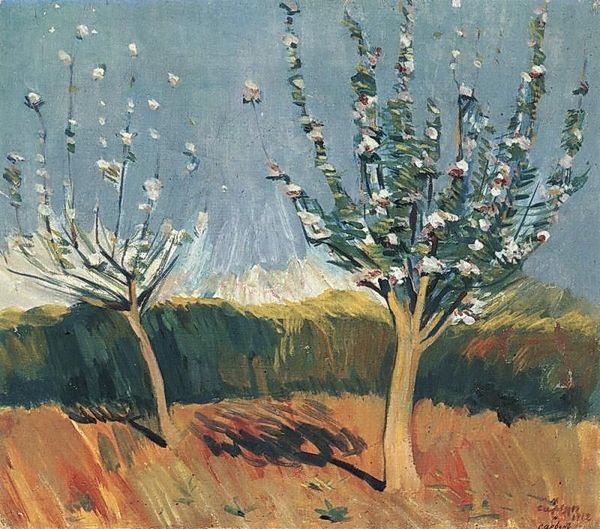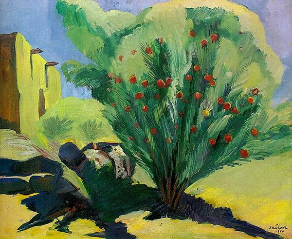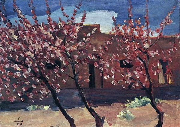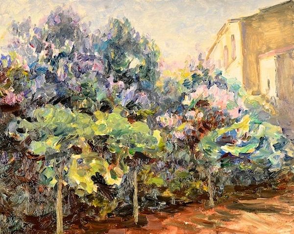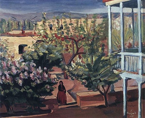 Martiros Sarian painted "A Lilac Bush" in 1922, using oil. The painting portrays a lilac bush in the foreground, set against a stark architectural backdrop. Painted in Armenia, this work reflects a period of intense social and political change. Sarian, having witnessed the Armenian genocide and the subsequent establishment of the Armenian Soviet Socialist Republic, infuses the painting with a sense of resilience and rebirth. The lilac bush, bursting with purple blooms, is a potent symbol of renewal and hope amidst the surrounding landscape. The use of bold colors and simplified forms hints at the influence of European modernism, but the subject matter remains firmly rooted in the artist's cultural heritage. To fully appreciate this work, one could consult historical archives detailing Armenia's socio-political landscape in the early 20th century, examining how artists navigated the complex interplay between tradition, modernity, and political ideology. Ultimately, Sarian's painting reminds us that art is not created in a vacuum, but is deeply intertwined with the social and institutional forces that shape its creation and reception.