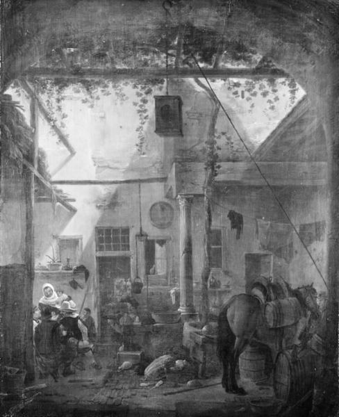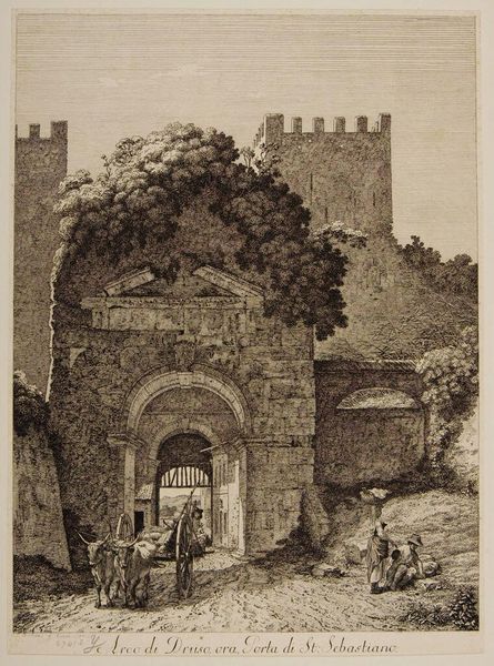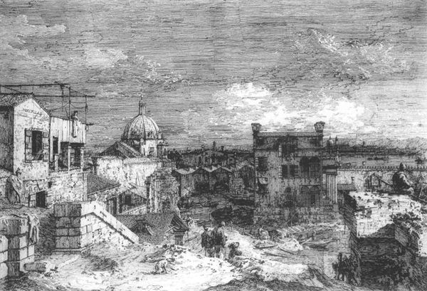 Curator: Let’s consider this print by Canaletto, "Capriccio with a Portico," found in a private collection. The scene is an imagined architectural fantasy, realized as an engraving. Editor: It’s wonderfully moody, isn't it? The stark contrasts and decaying grandeur immediately create a sense of melancholy. There's a tension between the aspiration of classical forms and their ruinous state, it speaks of transience and perhaps lost empires. Curator: Precisely. Canaletto, celebrated for his Venetian cityscapes, frequently combined real and imagined elements. The "capriccio" style itself was an opportunity for social commentary. How do institutions use classical architecture to speak about power and status, for example? Editor: Look at that bizarre cage hanging from the arch. It's unsettling, adding an element of the grotesque to an otherwise classical landscape. Is it a comment on imprisonment? What does that mean if considered intersectionally? Curator: Potentially. He was working in a Venice rife with political tensions, even though overtly these engravings may appear just a lovely decorative scenes, but you're correct—the use of symbols is far more than just decoration. Consider the placement of figures – almost like bystanders, alienated from the space. Editor: They feel trapped by the immensity of it all. It feels a space only designed for the rich and elite. Who benefits from such grandiose imagery? Is this supposed grandeur used to legitimise historical or current social stratifications? Curator: Absolutely. He cleverly positions the viewer to question the reality presented, both aesthetic and political. Art in public spaces, then and now, still serves such purposes of ideological influence. Editor: So true, seeing these works encourages a critical re-examination of these urban spaces as spaces where cultural power continues to shape our perceptions of the present. Curator: Examining how he captures light, and constructs perspective offers fascinating details too, considering this as part of a longer artistic tradition—each stroke intentionally constructed. Editor: Looking closely opens up new readings; the conversation expands, moving from technique to consider broader concerns, a powerful testimony of Canaletto's enduring ability.