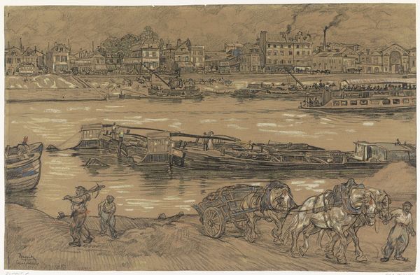 Curator: Before us is Frank Duveneck’s 1883 etching, "View of the Grand Canal," held at the Art Institute of Chicago. Editor: It’s lively! A little murky, perhaps, but bursting with details; a busy scene frozen in time, teeming with anonymous figures. What’s captivating is how Duveneck conjures so much atmosphere with so little. Curator: That murkiness, as you say, becomes almost symbolic when we consider Venice. Its history, its weight as a cultural center—all emerge from this slightly faded sepia palette. The Grand Canal, then, becomes a kind of mirrored surface reflecting collective memory. Editor: Well, look closer at how the ink bites into the paper. The lines aren’t just descriptive; they create texture, a palpable sense of dampness, of age and wear on the palazzi lining the canal. The social context is implied by those figures, of course, going about their business along the fondamenta. It is interesting how he achieved that, laboriously using metal tools and acid to carve the image on a metal plate. Curator: The buildings themselves could almost be read as hieroglyphs, repeating certain architectural motifs, echoing the passage of time. Note, too, the human figures – how some are rendered in detail, while others remain almost ghostly sketches. Do these represent fleeting encounters, forgotten stories, lost identities subsumed into the grandeur of the city? Editor: Or could it just be the difference in the stage of labor performed for each. From a Materialist point of view it suggests different applications of skill: less acid applied and the drawing on the plate hurried for those ghostly sketched people versus those where more precise, exacting care were enacted. But, as we discussed, is all labor equal? Where were the printing workshops, what sort of lives did etchers live at this time and does Duveneck reveal these things or, perhaps, intentionally obscure them? Curator: That contrast you highlight contributes to the dynamism, that almost cinematic feeling – very modern, really, for its time. It encapsulates the ephemeral quality of life in a city steeped in history. Editor: I concur with you in part there - the image vibrates with social energies caught through its meticulous creation in both composition, but equally the printing. Well, I could continue looking at Duveneck’s marks all day… Curator: As could I; it prompts endless reflection.