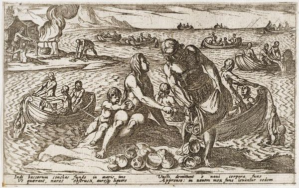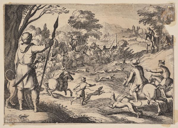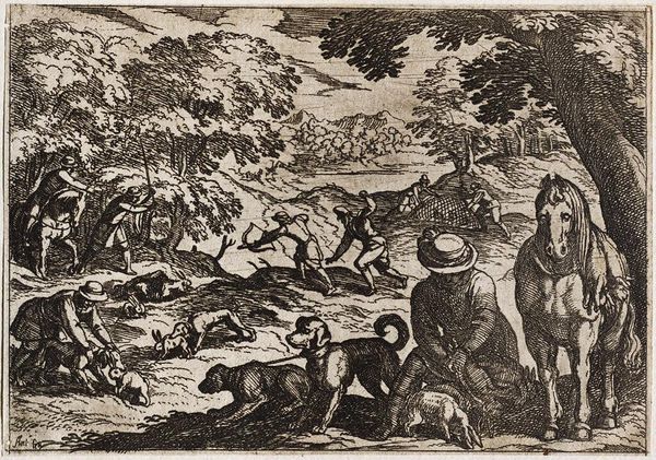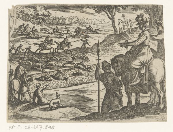 Editor: This is Antonio Tempesta's "Ladies Watching Hunters Chasing Animals into a Pit," created sometime between 1555 and 1630. It's incredibly dynamic! The use of line is so energized. What do you make of the composition? Curator: The dynamism you observe stems directly from Tempesta's masterful manipulation of line and form. Note the convergence of lines directing the eye toward the pit, serving as a focal point amidst the frenzied chase. This careful organization contributes to the overall effect of controlled chaos. Editor: I see it now! The lines create movement, but also a sense of order. Curator: Precisely. Observe how the foreground figures frame the action, inviting the viewer into the scene. The varying densities of line also create depth, don't you agree? Editor: Absolutely, the darker lines in the foreground really bring those figures forward. I'm starting to see how form and composition create this sense of lively organization. Curator: Indeed. By attending to the formal elements, we gain a deeper appreciation for the artist's intention and skill.
