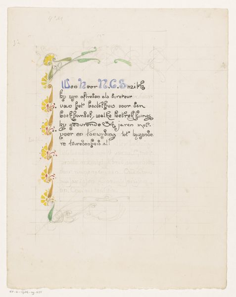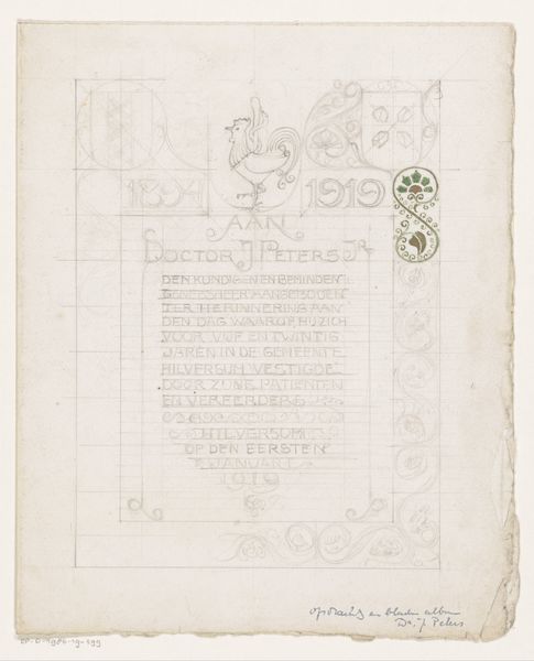 This is a design for a certificate by Reinier Willem Petrus de Vries, made around 1912, likely with ink and pencil on paper. De Vries was active during a time when Dutch society was navigating industrialization and shifts in cultural identity. The certificate's design, with its formal script and decorative flourishes, evokes a sense of tradition and authority. In a rapidly changing world, such documents served to reinforce established social structures, and offered a sense of continuity. Calligraphy itself, with its historical associations with scribes and officialdom, suggests a world where power resides in the written word. However, the design is also somewhat playful, with its whimsical borders and handwritten quality. There is also something inherently emotional about the care that has been taken to produce such a design, a hint towards the value and honor associated with being granted such a certificate. While reflecting societal norms, the artwork also represents the personal touch of the artist.