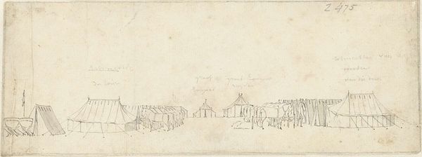 This drawing of the Cavalry Camp on the Malieveld in The Hague was created in 1742 by Cornelis Pronk. Executed with pen and brown ink, the composition presents a panoramic view, meticulously detailed with a network of fine lines. Pronk employs linear perspective to structure the scene. The array of tents and figures are receding into the distance. The light, almost transparent, quality of the drawing invites a study of its intricate details. The buildings and trees are rendered with precise, deliberate strokes. The artist's structural approach invites us to consider the principles of order and organization. We can ask, how do these choices affect our understanding of space and distance in the image? And how does the relationship between architectural elements, figures and landscape contribute to the overall meaning? The drawing is more than a mere representation of a scene; it is an exploration of form and spatial relations.