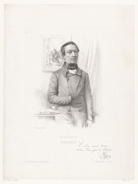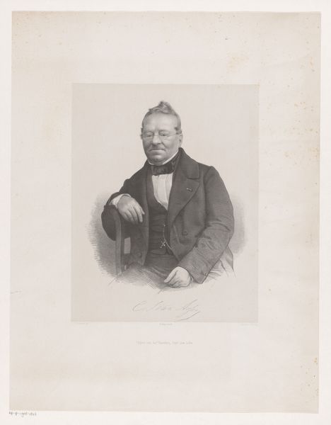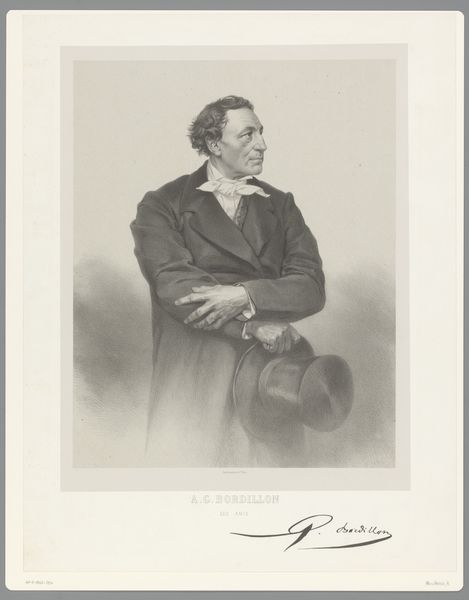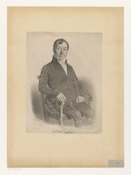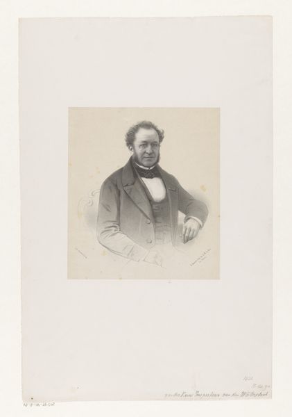 Editor: Here we have Johan Hendrik Hoffmeister’s graphite drawing "Portret van Hendrik Jacob Taets van Amerongen," created sometime between 1843 and 1863. The figure dominates the composition, doesn't he? What is most striking to you about the formal aspects of this work? Curator: The rendering of texture. Notice the meticulous layering of graphite, used to distinguish fabric from skin. See how the artist manipulates line weight to articulate form and volume, creating a compelling surface contrast between the rough woolen coat and the smoother textures of the face. It shows careful planning and skilled execution. Editor: I see that, especially in the detailing of the coat and the soft modeling of his face. What does this level of detail suggest? Curator: It points to a conscious choice of realism. By meticulously capturing the texture and details of the sitter's physical presence, Hoffmeister directs our gaze. We're encouraged to appreciate not just the likeness but the artistry in rendering. Consider also the distribution of light and shadow. Editor: How does that contribute to the portrait overall? Curator: Note how the artist has skillfully modeled his face and coat using contrasting values. The overall structure becomes a compelling aesthetic experience divorced from any immediate narrative context. Editor: It's amazing how much can be conveyed just through lines and shading! I learned so much today about the value of material qualities. Curator: Indeed! Looking closely reveals new perspectives. I think I will contemplate further how texture adds nuance.
