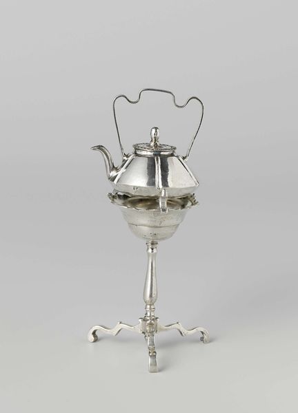 This is a silver "Komfoor op driepoot," or brazier on a tripod, made by Frederik van Strant II in the 18th century. The brazier, elevated on its three legs, immediately calls to mind the ancient Delphic tripod, a symbol of prophecy and divine wisdom. The tripod, a recurring motif from ancient Greece to modern symbolism, elevates the object it supports to a place of reverence, suggesting its sacredness. In this context, the brazier becomes more than a mere household object; it symbolizes hearth and home as a sacred space. Consider how fire, contained within the brazier, mirrors the eternal flame, an archetypal image representing knowledge, enlightenment, and the enduring human spirit. This form transcends time, reappearing in diverse cultural contexts. The symbol of the tripod and the flame speaks to a collective memory, an echo of humanity's primal relationship with fire, adapted and reinterpreted across centuries.