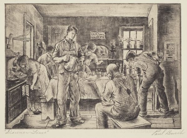 Reinhold Werner's drawing, "Workers Having a Meal," captures a seemingly mundane scene, but one ripe with social context. Likely created in Germany around the turn of the 20th century, it depicts laborers gathered for a break, a moment of respite in their demanding work. The setting, possibly a cellar or storage area, underscores their working-class status, a visual code reinforced by their clothing and worn features. The artist invites us to consider the socio-economic conditions of the time, where industrialization was reshaping society and labor movements were gaining momentum. This image reflects the growing awareness and social consciousness within artistic circles. Archival records of labor conditions, worker's diaries, and socialist publications of the time can provide deeper insights into the world depicted. Werner’s drawing serves as a valuable lens for understanding the lives and struggles of the working class in a rapidly changing society.