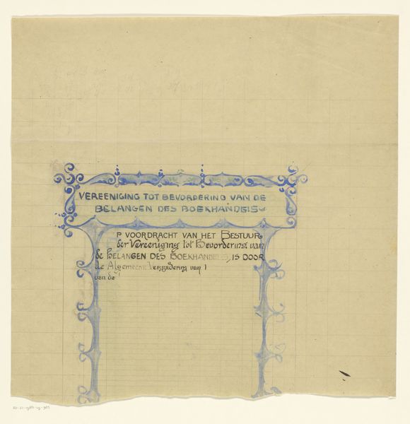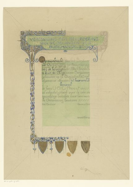 Editor: Here we have Reinier Willem Petrus de Vries’s “Ontwerp voor een opdrachtblad voor de heer N.C. Smith,” a mixed-media drawing created around 1911. It's delicate, almost ethereal, with its watercolour accents and handwritten text. It seems like an official presentation document, but I’m unsure of its broader context. How do you interpret this work, especially its intended purpose within society? Curator: It’s crucial to consider this piece within the context of early 20th-century Dutch society, where Art Nouveau was flourishing. These presentation documents were not merely functional; they were statements of prestige and civic pride. Consider who N.C. Smith was – likely an important local figure if a bespoke “opdrachtblad” was commissioned. How might the aesthetics here contribute to the perceived legitimacy or authority of that figure? Editor: So, the artistic style adds to the person's public image. The Art Nouveau elements – the stylized floral patterns, the elegant calligraphy – project an image of refinement and progress, which gets associated with Mr. Smith. But does the exclusivity of such commissions exacerbate social inequalities? Curator: Precisely. These commissions would have been accessible only to a select elite, thereby reinforcing existing power structures. Art becomes a tool for social stratification. Think about the institutions involved: who commissioned it? Which societal class would appreciate it the most? These factors contribute to the artwork’s role in constructing social meaning. Does this alter your understanding of its initial 'ethereal' quality? Editor: Definitely. It's less about delicacy now and more about the subtle power dynamics encoded in the art style and its intended audience. It highlights the way even seemingly harmless artwork can become implicated in complex social dynamics. Curator: Indeed. This serves as a reminder of art's dual function, both aesthetic and deeply entwined with its sociopolitical framework.
