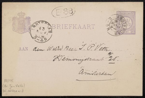 Curator: This piece, entitled "Briefkaart aan Philip Zilcken," is attributed to Derk Wiggers, dating to around 1925 or earlier. It is rendered in pen and ink on paper. A simple pen sketch that reveals an intimate correspondence frozen in time. Editor: It is so minimalist, almost ethereal. The delicate script dances across the aged paper; the postmarks give it a tangible link to another era. There’s a poignancy in these personal remnants that official portraits often lack. Curator: Absolutely, and it brings to the forefront questions of art as not just creation but also artifact, especially considering it is, after all, a postcard. Who was Philip Zilcken and what socio-political circumstances allowed for their correspondence to take place, where art and communication collide in this object? We see in the stamps the very mechanics of an empire manifested on paper. Editor: Right! And the handwriting becomes a site of identity and intention, both conscious and unconscious. How does that relate to notions of authenticity within artistic creation versus personal correspondence, particularly when authorship is clearly marked but the message remains shielded? I want to investigate that line between the public persona of art versus private life. Curator: Precisely. Its presence in our collection asks critical questions about what and whose stories are considered worthy of preservation. What frameworks are in place, socially, culturally and economically to give credence to artworks but disregard daily experiences? We can see the echoes of Derrida in our deconstruction. Editor: For me, the appeal rests in how it elevates something mundane into something quietly extraordinary through attention and curation, urging reflection on how societal biases influence artistic narratives. It suggests avenues for subversion, challenging notions of access, audience, and ultimately the politics inherent in how and why certain pieces come to represent broader movements or cultural sentiments, and in which circumstances! Curator: Exactly. A humble reminder to continually question the lenses through which we view history, culture and art and that an avant-garde art collection can embrace all expressions. Editor: I wholeheartedly agree. Its whisper speaks volumes, resonating powerfully amidst grander, louder statements, a humble reminder of a quieter humanity.