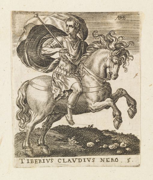 Editor: Here we have "Beroald, fourth king of the Frisians," an engraving by Pieter Feddes van Harlingen, made between 1618 and 1620. What strikes me is the figure of the king in almost a frenzied state on horseback, contrasted against the shield bearing what appear to be water lily leaves. What can you tell me about what’s being represented here? Curator: Look closely – how is the crossbow aimed, and at what? Consider also the gesture of the king's free hand. It’s an image riddled with symbolism! That crossbow pointed skyward may represent divine rejection, especially considering his crown seems to be falling from his head. The shield beside him alludes to Frisia, but perhaps more pointedly, its threatened stability. He seems to be at the very moment of his downfall, yes? Editor: That's a perspective I hadn’t considered, the idea of imminent downfall being visually represented. And so, that shield isn't necessarily just an emblem of his kingdom, but also symbolic of something bigger? Curator: Precisely! Consider, too, how frequently rulers employed visual allegories – images serving as warnings or claims to legitimacy. What kind of cultural anxieties or aspirations might an image like this evoke in its contemporary audience? Is this image one of warning or celebration? The crown in freefall gives us our biggest hint. Editor: It definitely feels more cautionary tale than heroic portrait when viewed through that lens. It shows how historical narratives can be embedded in what appear to be straightforward depictions. Curator: Yes, and understanding those symbolic languages allows us to hear the whispers of the past embedded within the image.