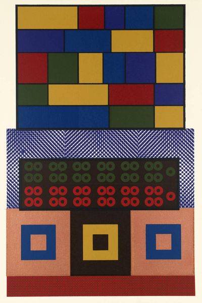 Curator: I find Ian Tyson’s "Mask Masque," held in the Tate Collections, so compelling. It's a screenprint featuring a grid of red, white, and blue squares against a stark black background. Editor: It hits me as almost playful, in a severe sort of way. Like a Mondrian trying to loosen up after a rather long week. Curator: Its rigid structure might be read as a commentary on societal constraints and the ways in which identity can be both performed and concealed. Think about the historical context of masking. Editor: Right, the title itself, "Mask Masque," feels ironic. It's so exposed, so un-hidden. Almost like a mask that reveals more than it conceals. Curator: Precisely. The limited palette and geometric forms also echo the politicized visual language of modernism, perhaps reflecting on the construction of national identities. Editor: It's interesting how something so simple can hold such a complex web of meanings. It invites you to project your own narrative onto it. Curator: Absolutely, and it’s precisely that ambiguity that keeps me returning to it. Editor: Me too. It's like looking in a mirror and seeing a question mark staring back.