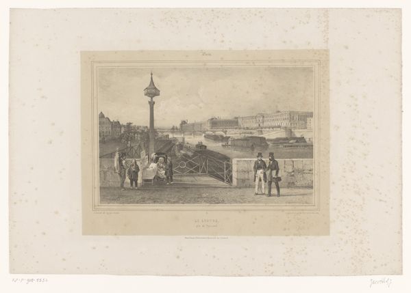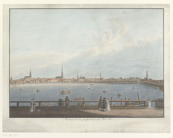 Editor: Here we have Hendrik Wilhelmus Last's "View of Arnhem at the pontoon bridge", likely created sometime between 1827 and 1873. It’s a watercolour painting showcasing a vibrant cityscape. The scene feels idyllic, almost like a snapshot of a peaceful, bygone era. What visual echoes do you notice in this piece? Curator: Immediately, the figures remind me of stage actors; each pose carries weight and meaning. See how the artist uses symbols of industry, such as the steamboat, against the pedestrian bridge filled with horses and families. Do you notice how both connect people yet contrast the modern with the pastoral? Editor: That’s a great point! It feels like a deliberate commentary. The smoke billowing from the steamboat also suggests a kind of encroachment on the natural landscape. Curator: Precisely. It evokes a feeling of transition, that moment when industrial progress begins to reshape traditional life. Even the decorative border emphasizes a cultural longing for something slipping away. Editor: It's interesting how the artist embeds social commentary within such a beautiful, almost picturesque scene. Does that blend speak to the Romanticism movement? Curator: Absolutely! It yearns for harmony with the natural world, even as that world faces upheaval. This tension, embodied by the figures frozen in time, allows viewers across generations to reflect on change and continuity. Editor: I see that now! I initially perceived it as merely a pretty picture, but it has far greater depth than I initially gave it credit for. Thanks for pointing that out. Curator: My pleasure. Discovering the hidden language of imagery is, for me, a profound experience!