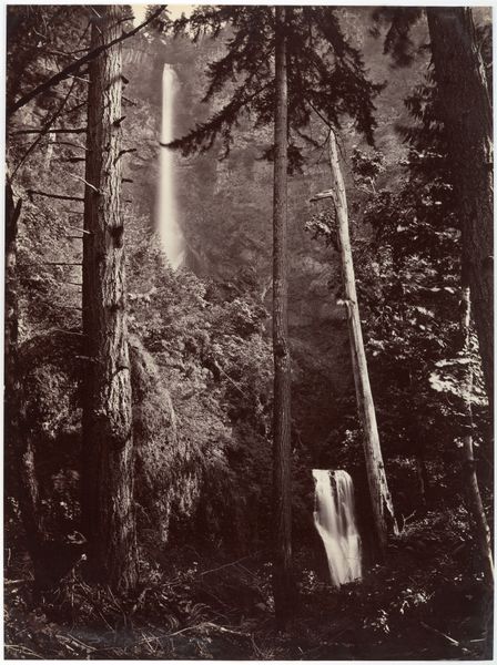 Curator: Look at the high contrast of the light, almost meditative effect it casts; our eyes flow right toward the water. Editor: Well, that focus is created through pretty standard darkroom processes, no? This gelatin-silver print from between 1921 and 1922, titled "Waterval in het woud," focuses our vision as you say but mostly through applied technique. Curator: I wouldn't disagree that photographic manipulation contributes here, but look at the figure posed above the falls! Doesn’t this resonate with archetypal imagery of the wise hermit who lives separate from the village? Or perhaps the image suggests a yogi finding serenity in nature. Editor: Perhaps. Or perhaps it is just an emphasis on exoticism through photographic technology. The material conditions made this possible—the colonial subject, brought to Europe through mechanical reproduction for mass consumption. Who do we imagine this figure *is* in the frame of a gelatin print made during the Interwar period? Curator: A person deeply interconnected with the earth—with place! The water falling implies transformation. And I love the tonal range; even without color, the silver brings an amazing luminosity and texture. It's incredibly calming, and there's a quiet dignity to it, don't you think? The realism adds to this emotional clarity. Editor: I will grant it a sort of charm. I can only wonder about labor and production when looking at photography like this. But there is the undeniable fact that the relatively easy manufacture of images like this drove their widespread dissemination and consumption. Curator: Well, it makes one reconsider what one understands about connection. Editor: Perhaps the artifice driving what we might perceive as direct, real connection makes *us* see a constructedness inherent to it? Anyway, I appreciate getting to talk about image production here.