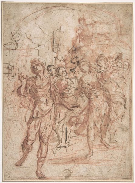 Curator: At first glance, I'm struck by the monochromatic earthiness of this drawing. It evokes a kind of humble simplicity. Editor: Indeed. We're looking at a pen and ink drawing on paper, attributed to Sigismondo Caula, dating somewhere between 1637 and 1724. The museum has titled it "En gruppe hyrder, i deres midte en ung hyrde, der fort\u00e6llende peger mod himlen. Josef imellem sine br\u00f8dre?". Curator: The texture of the paper itself seems integral to the piece. The ink bleeds slightly, giving it this aged, almost worn feeling. Was paper readily available, or would that have influenced the work’s value? Editor: Paper was becoming increasingly available, facilitating a broader artistic output and aiding in dissemination of artistic ideas. Note the suggested narrative within the work, prompting conversations and interpretations among viewers. Caula was active in the social context of artistic and religious patronage. This theme nods to storytelling in public life at the time. Curator: Absolutely, there’s an intentional ambiguity here. What narrative is this image enacting and how might we better engage the viewer? I see such expressive hand gestures; pointing fingers directing us upward. Editor: These images are designed for public viewing in places of importance, to convey some version of the truth or encourage shared interpretations that bolster particular ideology. The materiality – the very portability of paper for preparatory studies like these suggests the growing accessibility and exchange of images. It's housed at the SMK – Statens Museum for Kunst. Its presence there highlights how art collections preserve, classify and make meaning through acts of public consumption. Curator: It's fascinating how such simple materials - ink, pen, paper - can convey such depth. Considering how its very making speaks to how and for whom such narratives were deployed underscores just how embedded materiality and meaning are here. Editor: A worthy reminder, I think, of how considering art's creation impacts reception—a dialogue shaped both by its means and the societal moment in which it was received.