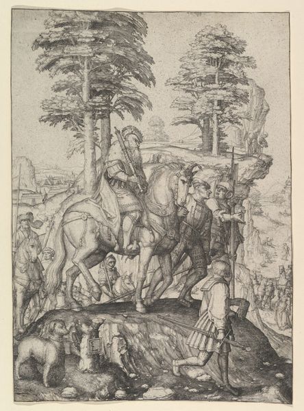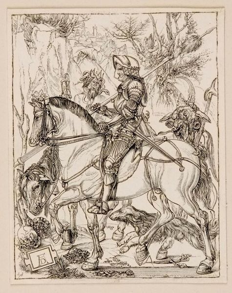 Albrecht Dürer crafted this small engraving titled "The Little Courier" using burin on paper. Notice how the stark contrast between the black lines and the white paper creates a dramatic effect. The composition is divided diagonally, with a dense forest on the right balancing the open landscape to the left. Dürer's meticulous use of line – thick and thin, closely packed and widely spaced – not only defines shapes but also creates a palpable sense of depth and texture. The horse and rider are rendered with incredible detail, conveying movement and energy. The rider's raised sword, combined with the horse's gallop, infuses the scene with a sense of urgency and action. The landscape, complete with a distant castle, adds a layer of narrative. The dense, almost claustrophobic forest contrasts with the openness of the fields. Consider how Dürer’s mastery lies not just in his technical skill but in his ability to create a dynamic interplay of form and space, inviting viewers to project their own narratives onto the scene.