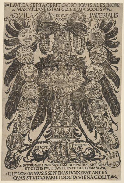 Curator: Looking at this complex genealogical rendering—a print from somewhere between 1535 and 1594, attributed to Jakob Clauser—what's your initial reaction? It's called "Stamboom van Frederik en Ottheinrich van Palts-Neuburg (plaat 5)", and it resides here at the Rijksmuseum. Editor: My first impression is one of incredible intricacy. It's so densely packed with detail; the interweaving branches create a labyrinthine effect. Almost dizzying! Curator: Exactly. It's more than just a family tree; it's a deliberate visual argument about power and lineage. Think about the historical context: the Northern Renaissance was a time of intense dynastic maneuvering and solidifying claims to legitimacy through bloodlines. The ‘Stamboom’ becomes a powerful statement of identity. Editor: I see the symbolic language. The tree itself, of course, represents growth, stability, the enduring nature of the family. And each figure meticulously placed, with their accompanying crests… it speaks volumes. I am also intrigued by the cross at the bottom right, as well as the little vignettes: people are engaging in common activities in most sections of the image. Is it possible to identify the origin and meanings behind these additional symbols? Curator: Well, yes. We know that the family tree format itself was becoming increasingly popular in courtly settings as visual displays of nobility. But this one... it elevates that to high art and complex visual rhetoric, a status report. It serves to highlight the family's claims and their connections through carefully constructed imagery and symbolic heraldry. Gender also plays a key role. Notice how specific unions solidify claims to specific territories. Editor: That’s interesting! In what way? Curator: Well, strategically selected or created unions of two important aristocratic families or people will create future opportunities to stake a claim for land or a higher position on behalf of their descendants. So by controlling marriage one can control the future! The selection of who to include and how to visually emphasize their position within the tree… it's all carefully calculated for maximum impact. Editor: Looking closer, it's almost like reading a story – the visual elements build a narrative around this family's ascent. Knowing these symbols is really key to reading this complicated drawing. Curator: Absolutely, decoding those symbols offers an extraordinary insight into the world view and self-presentation of the Palatine Neuburg family. The artwork encourages us to unpack not just their family history, but the very principles and power dynamics that shaped their identity. Editor: Seeing it in that light really deepens my understanding. I initially saw a dense drawing, but now it feels like an intricate map charting political and social strategy.
