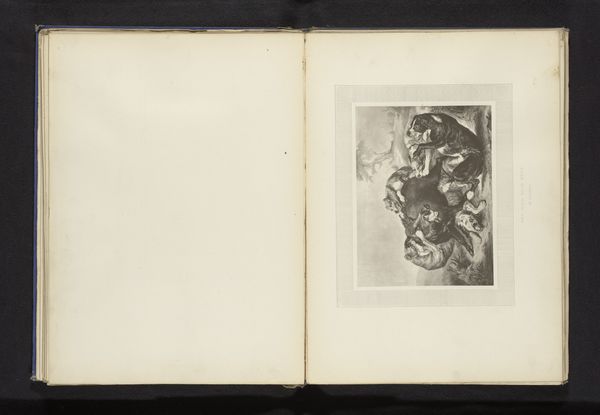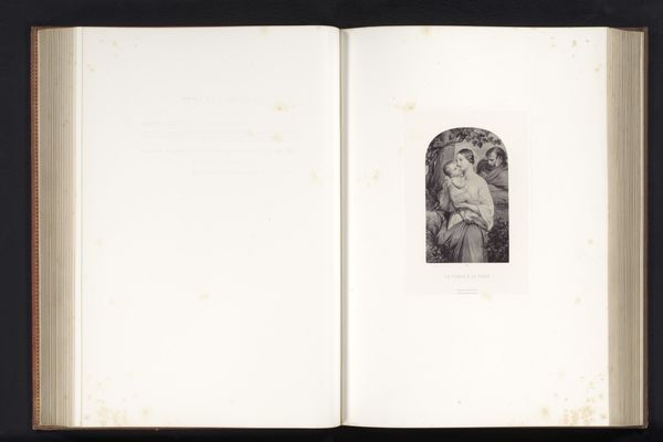 Editor: So, here we have a photographic reproduction of a drawing titled "The Last Prayer of Mary Stuart" by Paul Delaroche, sometime before 1858. It’s rendered as a print on paper, part of a larger bound volume. It strikes me as…intimate, almost hidden amidst the vast blank pages. What do you see in how the image's reproduced, almost presented as ephemera? Curator: I'm immediately drawn to the book itself. The physicality of the bound paper, the printing process… these weren’t neutral choices. Consider the labor involved: the papermaking, the drawing itself by Delaroche, then the reproductive printmaking and binding into a volume. Who was meant to consume this, and how did that shape the work? Was it mass-produced for wider distribution, or something more bespoke? Editor: Interesting! I hadn’t thought about the implications of the book format so much. Does that mass-production suggest something about how Delaroche’s work, originally conceived as a drawing, circulated and gained meaning? Curator: Exactly. It makes me consider who was buying these kinds of prints, or even pirated versions of them. Did access to these images empower wider audiences by connecting them to historical narratives? And what was the relationship between "high" art, like Delaroche’s drawing, and the craft of printmaking that brought it to a wider public? Was its materiality valued, or did this process cheapen its social importance as a fine drawing by a recognised master? Editor: That definitely makes me think about the power of reproducible media and how it reshapes our understanding of historical moments and artists. I suppose I had initially focused just on the depiction of Mary Stuart, but you've helped me appreciate the broader context and the work's journey. Curator: Seeing this work now opens the window to those original decisions around artistic creation and commodification. I wonder if we will ever know the real drivers behind this work's selection for inclusion within this particular book?