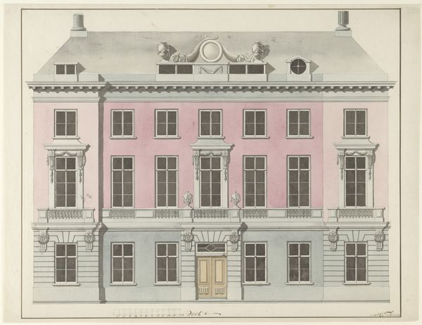 Editor: So, here we have Andreas Schneidmann’s “Drawing for the Street Elevation of a Town House” from 1729. It's a print, seemingly based on an architectural drawing. There's something quite formal and ordered about it, yet the gables and scrolls add an intriguing touch of whimsy. What do you make of it? Curator: It's fascinating how Schneidmann employs baroque architectural elements, such as those swirling volutes, which become cultural markers. They speak to the enduring power of classicism but with a playful adaptation. Notice how the façade's symmetry is almost obsessively maintained; what might that strict balance have represented to the society of that era? Editor: Perhaps a desire for order and stability? Curator: Precisely. Architecture has long been a visual shorthand for social and political values. Consider the repeated rectangles of the windows—each a potential portal into private lives, all contained within a public face. This presents a compelling symbolic interplay between the individual and the collective. What stories might this house contain? Editor: I guess it projects an outward image of composure while suggesting hidden depths. Curator: Indeed. And the symbols extend beyond aesthetics. Consider the unadorned doorway: a symbolic entry point, the promise of passage. Architecture serves not only as shelter but as a stage upon which the theater of life unfolds, layered with societal meaning and historical significance. I wonder about the kind of person who was meant to dwell within these walls and which values they subscribed to… Editor: It’s incredible how much symbolism can be packed into a simple building elevation. This has made me rethink how I look at architectural drawings. Curator: That's the beauty of engaging with art—it continually reshapes our perception. Every line, every choice carries meaning waiting to be decoded.
