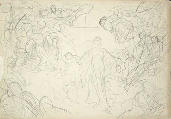 Curator: Here we have "Monkeys Making Music," a sketch attributed to the Manner of Claude Gillot, at the Harvard Art Museums. It’s a delicate work on paper, measuring about 30 by 21 centimeters. Editor: My first thought is of a dream, or perhaps a feverish hallucination. The monkeys, rendered in such loose lines, create a strangely unsettling atmosphere. Curator: Well, the imagery of monkeys often carries connotations of mimicry, foolishness, and even subversion. Consider the material realities of the time; were these images intended as satire aimed at the aristocracy? Editor: I think it runs deeper. The instruments themselves symbolize harmony and order, but the monkeys introduce chaos. Is this about the fragility of societal structures? Curator: Or perhaps the role of artistic production in questioning those structures, by literally monkeying around with established forms? Editor: I hadn’t thought of that. The playful symbolism certainly allows for multiple interpretations. Curator: It’s fascinating how one reading of the drawing’s materials shifts the whole meaning. Editor: Indeed. It seems there’s more than music being composed here.