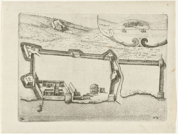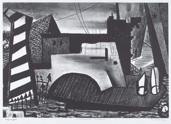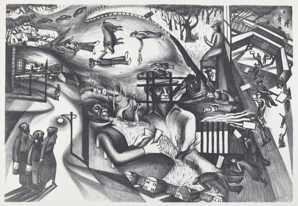 Editor: This is Lamar Baker’s print, "Walk Into My Parlor" from 1940. The dreamlike, almost surreal, quality is really striking. What stands out most is the composition, the way he’s arranged these disparate elements within a single frame. What do you see in it? Curator: The first thing that commands attention is the rigorous formal organization of the print. Baker creates a clear, though unsettling, hierarchy through the strategic placement of forms. Note how the weaving machinery, the spinning wheel, and the distant cotton mill are connected by a literal spiderweb. This network imposes a visual structure but also speaks to relationships within the image itself. Editor: So you're saying the spiderweb acts as more than just a background detail, that it structurally unifies the composition? Curator: Precisely. It's a calculated device to create unity within a potentially chaotic arrangement. Also consider Baker’s effective use of contrasting tones. The stark juxtaposition of light and shadow amplifies the underlying tensions, creating a palpable sense of unease. Observe how this stark contrast directs our eyes through the artwork, lingering on certain elements while quickly glossing over others. How do these contrasts make you feel as a viewer? Editor: They definitely heighten the dreamlike, slightly unsettling feeling, like you’re trapped within this constructed space. The heavy machinery against the domestic scene… it’s a potent juxtaposition. I see now how he's layering these structural and formal contrasts to generate meaning beyond just the surface representation. Curator: Indeed. It's through this careful arrangement of form and contrast that the work achieves its lasting impact, prompting questions about progress, entrapment, and the artist's position. Editor: Thanks, I understand it better by exploring the intrinsic formal structure, especially the web unifying everything.