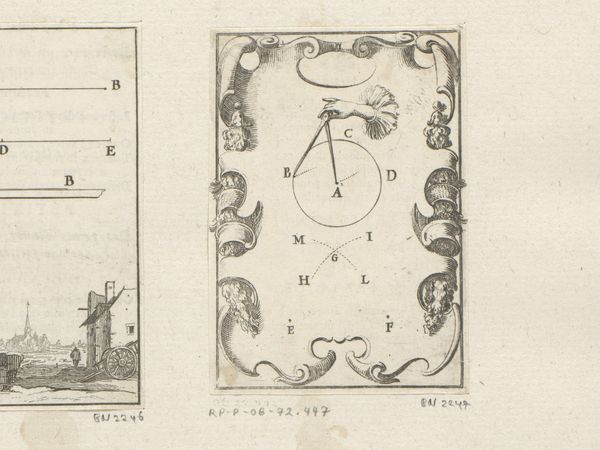 This print, "Defining a Point," was made by Sébastien Leclerc I. Notice how the composition is structured around a symmetrical, decorative wreath. This wreath, meticulously detailed, frames three points labeled A, B, and C, arranged in a deliberate geometric configuration. Leclerc employs line and form here not merely as representational tools, but as conceptual devices. The abstract nature of the geometric shapes—the lines, crosses, and circle—contrasts with the organic, flowing lines of the wreath. This contrast destabilizes a clear distinction between the precision of geometry and the fluidity of nature. What does it mean to define a point? Is it an act of imposing order, like the wreath seeking to contain the geometry within, or is it an inherent property waiting to be discovered? The print serves as a reminder of the artist's role in defining and interpreting the world around us.