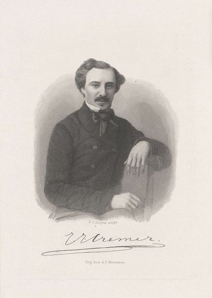 Curator: Immediately I'm struck by the confidence in his eyes; quite arresting! Editor: Yes, there's a steadiness about him. We're looking at a photographic portrait of Gustave Doré, dating back to 1867, created by Felix Nadar. He was quite a personality, Nadar. Curator: Indeed, he captured the great figures of his day. Beyond being a portrait, it resonates as a marker of status, even intellect. What symbols are jumping out at you? Editor: I see an elegance, certainly. The cravat's askew in a very deliberate, artful way. He's an artist through and through. The softness of the image has a painterly quality, doesn't it? It softens the very stark reality of early photography. Curator: Exactly. That soft focus isn’t accidental. It speaks to the Romantic movement, and photography's attempt to legitimize itself alongside painting. Observe also the implicit symbols of wealth: his garments and seated posture signify comfort. Editor: Absolutely, yet that comfortable posture is juxtaposed with his gaze – unflinching, thoughtful... He appears almost confrontational despite being seated. It makes me wonder about their interaction; Doré and Nadar. What was that creative process like? Did Doré participate, perhaps even dictate some of the composition? Curator: Possibly. Doré certainly was a successful artist, famed for his illustrations of Dante, the Bible… Nadar may have ceded some control. The slightly melancholic expression is, perhaps, an allusion to the artist's genius but it does strike me more that he exudes capability. It says to me I can be intense. Editor: Definitely intense, and the monochrome amplifies it. Though the color is absent, everything feels highly charged with intention and purpose, I feel pulled into this man's life. It makes me question the relationship between inner thought and its external representation. A kind of performance, perhaps. Curator: And the mustache is of that period, signaling artistic or literary leanings. In short, it serves to signal not just his individual identity, but also membership of a subculture. We all long to see ourselves somewhere on a larger cultural map. Editor: This piece is definitely much more than just a photograph of Gustave Doré; it’s about representation. It’s about how one positions oneself within the complex narratives of their time. Fascinating stuff. Curator: It certainly makes one pause, contemplate and question how society itself defines us by image alone, and what our faces have to tell about those assumptions.