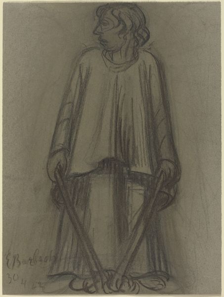 Curator: Here we have "Standing Man with Helmet and Rolled-up Breeches," a drawing rendered in charcoal, graphite, and pencil on paper by Johannes Abraham Mondt in 1892. Editor: He looks utterly alone. Sort of melancholy. The starkness of the light just emphasizing the almost greyed-out figure against the dark background... He’s holding his hands behind his back in a way that makes him look vulnerable. Curator: The artist, though relatively unknown, captured a palpable mood, and I wonder what you make of his sartorial choices. Note the helmet and unusual breeches; might they symbolize something deeper about the subject's identity or occupation, or is it simply a glimpse into everyday life? Editor: You know, the helmet throws me. Is it protective? Comical, even? There's something unsettling in that contrast – the darkness surrounding him suggests a potential threat, but his attire... It almost undermines any sense of danger, makes him look like a character in a dark fairy tale. Curator: It's true; this divergence enhances its evocative quality. Helmets do traditionally stand for protection, but equally can suggest conflict or burden. Perhaps Mondt is reflecting on the complex psychological state of ordinary people at the end of the century? There is the hint of a modern, industrious sensibility, a turning point where older certainties face nascent challenges. Editor: Right, and maybe it’s also Mondt trying to capture that transitional angst… Or maybe he just saw a guy in some strange outfit and was compelled to sketch him. It feels like a fleeting moment captured on paper, yet loaded with a timeless emotion, like anxiety or isolation. Curator: Certainly the very act of standing in this almost unadorned space makes us acutely aware of our human existence: our hopes and fears, stripped bare by time and history. Editor: Beautifully put! It’s pieces like this, so unassuming, that sometimes burrow deepest into the mind. Thanks, Johannes! Curator: A pensive, shadowy reminder of universal burdens, wouldn’t you agree? A thought-provoking snapshot into human emotion through carefully observed details and stark artistic choices.