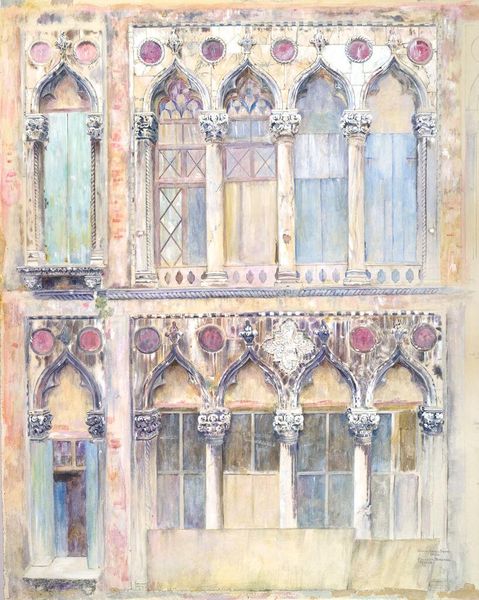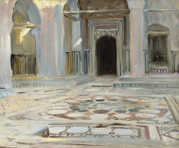 Editor: This watercolor piece, "Santa Maria della Salute, Venice," was created by John Singer Sargent in 1904. I’m immediately struck by the interplay of light and shadow and how the architectural details, though somewhat obscured, still manage to convey a sense of monumentality. How do you approach analyzing a piece like this? Curator: The initial access point is the formal arrangement: the organization of line, color, and shape, as well as surface and depth. Notice the striking contrast between the warm, muted tones used for the architectural details and the intense blue of the doors. Sargent manipulates color saturation to guide the viewer’s eye, constructing the architectural space as receding planes through tonal control. What is the impact on the composition of focusing the blue only in one small portion? Editor: It’s almost like the door becomes the focal point, contrasting sharply with the subtle hues surrounding it. Curator: Precisely. The door's emphatic blue also invites you to contemplate what meaning can be ascribed to this element through color semiotics. Here, a flat expanse of pure ultramarine halts any suggestion of atmospheric perspective to create an effect of compositional balance through chromatic symmetry. What effect might this balance suggest about how to engage with architecture itself? Editor: Perhaps a sense of stillness or contemplation rather than simply movement through space? The solid structure versus fluid light almost asks me to linger. Curator: An interesting point to make, it illustrates well how paying careful attention to the pictorial surface and compositional syntax unlocks deeper insights into how it delivers a specific aesthetic experience and what meaning we extract. Editor: I see! Thanks. It makes me appreciate the way even "realistic" works are so thoroughly constructed by an artist's deliberate choices in color, form, and arrangement. Curator: Exactly. By focusing on these intrinsic visual qualities, we can decipher not just what is depicted, but how the artwork conveys a particular experience and idea.