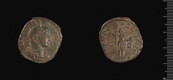 Editor: This is a Sestertius, a bronze coin of Maximinus I Thrax, currently held in the Harvard Art Museums. Given its age, its worn condition evokes a feeling of history, of lives long past. What stories does this coin whisper to you? Curator: For me, this coin isn't just an artifact; it’s a statement about power and its performative nature. Maximinus Thrax, a soldier emperor, likely used coinage as propaganda. The very act of minting his image, often idealized, reflects an attempt to legitimize his rule, particularly given his rise from humble origins. How does the coin's imagery reinforce or challenge societal hierarchies? Editor: That's fascinating. It never occurred to me to think about it as propaganda! Curator: Consider how gender, race, and class intersect within this imperial portrait. Whose stories are privileged, and whose are erased? It's a microcosm of the Roman Empire's complex power dynamics. Editor: This definitely gives me a lot to consider. Thanks for sharing your insight!