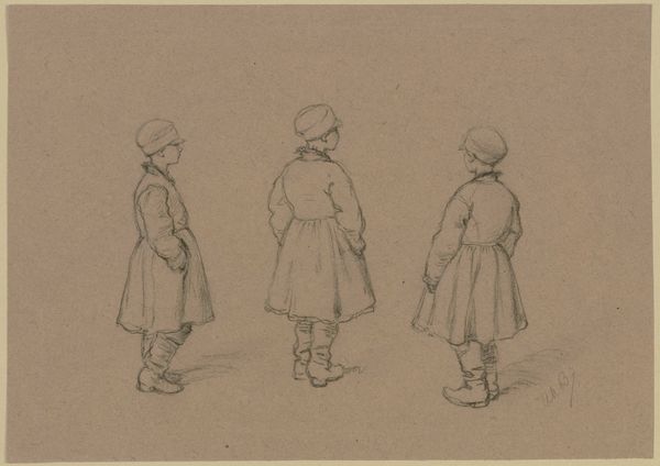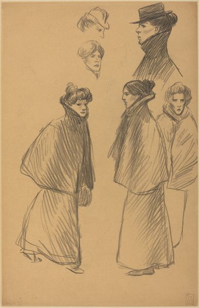 Curator: Johannes Abraham Mondt's "Drie studies van een wandelende dame in mantelkostuum," dating roughly from 1869 to 1941, presents three figures rendered in pencil. The drawing captures a woman in a coat and hat, repeated in slightly varied poses across the page. Editor: The immediacy is what strikes me first. It feels like a glimpse into a private sketchbook, something not quite meant for public consumption, carrying an energy both reserved and candid. Curator: Note how Mondt's quick pencil strokes construct the figures, giving texture and form. The lines are economically employed, suggesting volume and detail rather than painstakingly defining them. This reminds me of impressionist principles, which privilege capturing a fleeting moment and perceptual accuracy. Editor: It's interesting to view these "studies" not simply as technical exercises but also reflections on the burgeoning role of women in public space during this period. These women, equipped with their coats, hats, and canes, occupy the space with quiet assertiveness. Consider what it means for a woman to be "walking" into modernity during the end of the 19th Century and beginning of the 20th Century and how dress codes functioned to dictate where they had access. Curator: An astute observation. Yet I wonder, does Mondt's formal language lend itself to a focus on exterior details instead of more significant societal analysis? Editor: Form and content are not separable in my opinion; there are signs here. Consider the varying lines: darker to communicate a stiff military bearing to then taper in their strokes and reflect that the woman is also fashionable; the quick hatching shows that they move, too. So the sketch is capturing the experience of transition, which speaks more to their subjectivity than external elements. Curator: Perhaps the value here lies in this open invitation to view it in any variety of perspectives, depending on our lens and expectations, since it remains a fleeting trace. Editor: I see now, this sketch is an invitation. To move alongside these figures from over a century ago and also see the contemporary implications of this woman moving and what freedom for them has meant, and still means, for us.