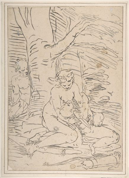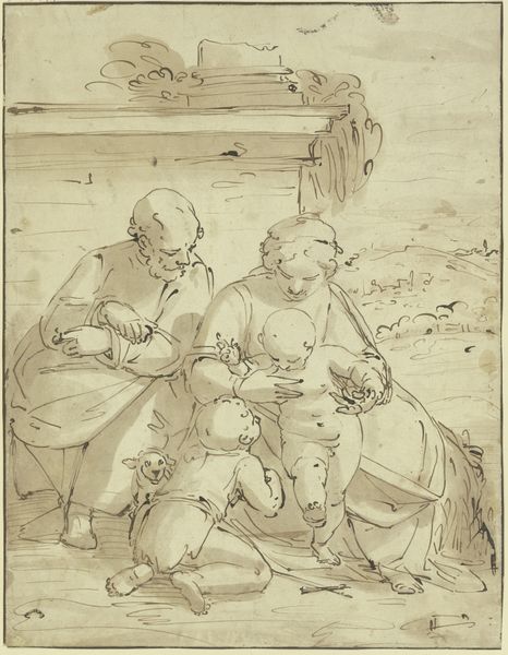 Curator: Right now, we are looking at "Holy Family with Saint Catherine," an ink drawing created by Luca Cambiaso sometime between 1570 and 1590, currently residing here at the Art Institute of Chicago. Editor: I’m struck by how minimal it feels, yet how much it conveys. It has this ethereal quality, like a half-remembered dream sketched onto paper. A kind of tender haze. Curator: Luca Cambiaso was a prominent figure in the Genoese School of the 16th century. During that time, historical paintings depicting familial groups, particularly within religious contexts, served as important ideological tools, promoting certain concepts of motherhood and family relations. This portrayal echoes dominant narratives but with nuanced perspectives. Editor: Right. Look at the way their heads are bowed, introspective, inward-looking. There's a shared intimacy, almost like a secret. It’s gentle but also intense, like they’re the only people on Earth. Curator: Considering the context of Mannerism, we might observe how the artist employs elongated forms, exaggerated gestures, and a somewhat flattened perspective to create a sense of artificiality and sophistication. These stylistic features deviate from the more naturalistic ideals of the High Renaissance. How does this play with contemporary audiences? Editor: Absolutely. There's a disconnect there, in a way that highlights the artist’s own presence. The starkness of the line work only adds to the intensity. It's almost brutally honest, despite the clear religious theme, hinting at complexities behind what we see at first glance. Curator: Ultimately, considering Cambiaso’s sociopolitical milieu, we can interpret this work as both reflecting and subtly interrogating the norms of his time. Editor: Yeah. Looking closer, the image gets almost tactile—rough edges, a nervous energy to the whole thing. Like seeing a beloved but tattered childhood photo, holding the imperfections, but filled with a familiar glow nonetheless.