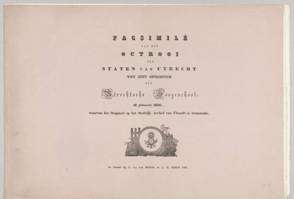 Curator: This print, created in 1832 by Stadsdrukkerij, served as an invitation to commemorate the bicentennial of the Athenaeum Illustre in Amsterdam. Note the carefully chosen typeface; the material's clear relationship with the then contemporary printing processes. Editor: It's quite stark, isn't it? Almost severe. Very formal, very official. One can picture the city council approving the wording... did many common folk even see these or would the intended audience be only those who could read and speak formally? Curator: The materiality is definitely significant here. It's typography at its core, printed on paper, acting as a vessel for information, specifically inviting the intelligentsia to attend the speeches delivered in Latin and Dutch. We see the production of knowledge intersecting with civic celebration and also urban printing practices. The very act of printing made it a public notice in a specific way that invited public consumption. Editor: Precisely. The Athenaeum was meant to be a symbol of progress and enlightenment. What narratives were being left out by this gesture? And whose "letters, arts, and sciences" were considered 'fair'? Curator: A valuable perspective! This wasn't just a piece of information design, it’s also a carefully considered work made using very specific materials to a select portion of society. There is paper and ink and time – physical expenditure and labor – all funneling into producing a sense of communal importance to the city's intellectual landscape. What typefaces were selected? And by whom? Those are important details that tell a story about craft and design of the period. Editor: Right. And framing the "city's intellectual landscape" within existing power dynamics becomes so apparent in even this simple printed invitation. It forces us to question who was actively included—and, just as importantly, excluded—from shaping Amsterdam's intellectual identity at that time. Curator: It makes me consider all the invisible labor behind something so seemingly straightforward... all those processes needed to transfer thoughts and ideas onto this inviting yet, as you suggest, rather stark paper. Editor: Exactly! Let's carry those questions of labor and access forward as we continue through our exhibition.