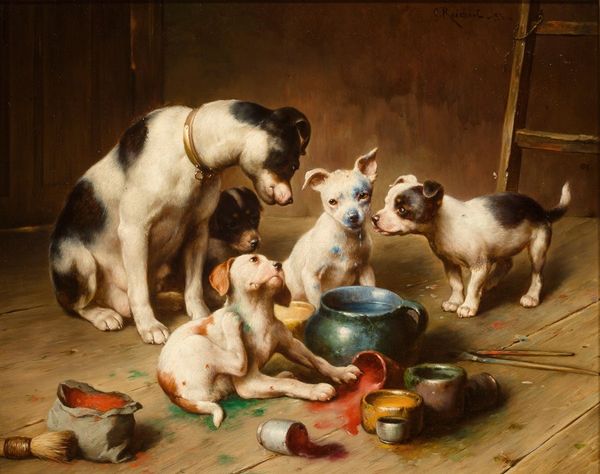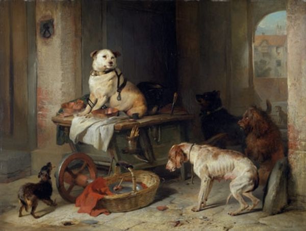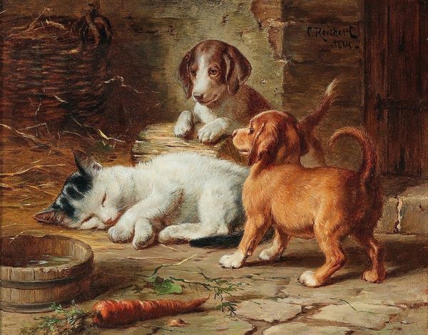 Editor: Here we have Carl Reichert’s "Beagle Puppies Feasting," painted in 1889 with oils. It is utterly charming and immediately made me smile. It seems like the puppies are creating chaos and mess! What does this work suggest to you? Curator: What's fascinating here is its embrace of sentimentality during a period defined by shifts in societal values and power structures. We see how genre painting like this found popularity within an emerging middle class eager to mirror aristocratic tastes, even down to canine portraiture. Consider the late 19th-century context: the rise of industrialization, shifts in land ownership. Does this idyllic portrayal perhaps function as a nostalgic retreat from the anxieties of rapid modernization? Editor: I hadn’t thought of it in those terms! It's easy to dismiss it as just a cute painting of puppies. So the act of idealizing this domestic scene has some real-world political connections. Curator: Precisely. The rising bourgeoisie consumed imagery that reinforced its values and aspirations. Who gets depicted and how – what’s valued and what isn’t – these choices are revealing about social currents. Note the style, firmly in the camp of Academic art, showcasing skillful realism while avoiding anything visually challenging. Who, do you imagine, commissioned or bought works like this? Editor: Someone wanting to demonstrate their good taste and their economic standing, maybe? So a painting of cute dogs could actually represent something much larger, like status and social anxieties! Curator: Exactly. Perhaps this artwork, beyond its surface charm, invites us to critically assess the relationship between art, power, and the construction of social narratives in a period of intense societal transformation. Editor: I'll never look at a puppy painting the same way again! It's fascinating how much history can be packed into such a seemingly simple image.