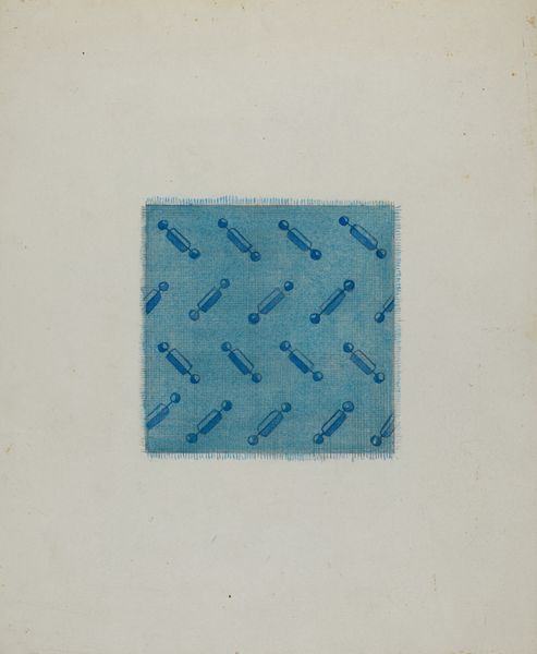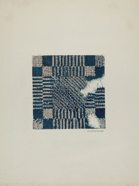 Curator: Looking at this geometric abstraction immediately evokes a sense of domesticity, almost a folk-art charm. It reminds me of quilts or woven placemats. What do you think? Editor: We're looking at "Coverlet (Section of)" by Ruth M. Barnes, dating from around 1940. It’s primarily a textile piece, using fibre-art techniques. Knowing the title suggests this piece, or at least, this section, has ties to personal stories, potentially domestic labour, craft traditions and class politics. Curator: Yes, the name lends a certain lived experience. Notice the limited palette—deep blue and white—creates a structured, almost rigid design despite the soft texture of the weaving. The repetition of geometric patterns feels comforting and perhaps subversive, a quiet revolt. Editor: Exactly. Consider the socio-economic context: women, often with limited access to formal art training, have historically expressed themselves through textiles. Coverlets and quilts can become coded narratives reflecting their experiences and perspectives. Did these textiles challenge conventional art hierarchies by creating beautiful, useful objects in traditionally marginalized spheres? Curator: Absolutely! And what about the viewer's experience? The square format and concentric patterns draw the eye inward. Is it creating a visual representation of confinement or intimacy, perhaps echoing societal expectations? What happens to women placed into defined "boxes"? Editor: That’s a potent observation. On a basic, socio-political level, textile production like this has historically held immense economic power for women in their households, although obviously limited. Understanding the art world, particularly its gendered aspects, invites broader reflections on representation and cultural values. What we find acceptable in the white cube. Curator: This piece, simple in its geometry and accessible in its function, opens up those important questions. Editor: And reminds us that what we may immediately consider "craft" holds rich socio-political and artistic dimensions.