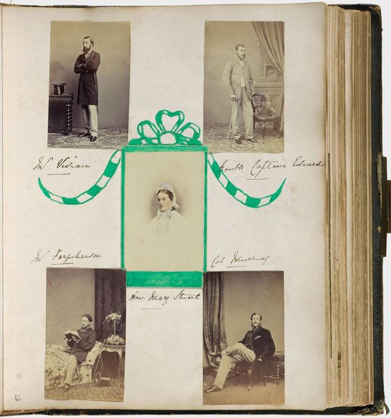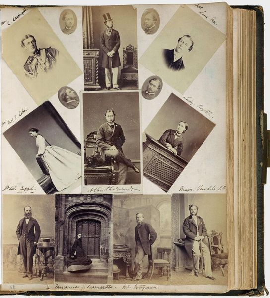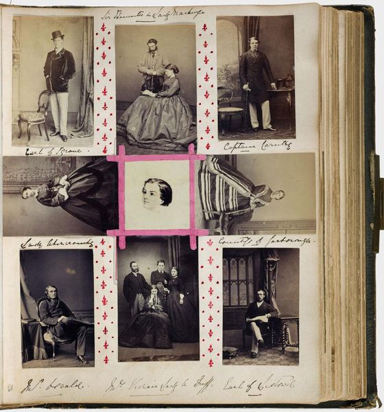 Editor: This is an intriguing untitled work from an album of photographs by Mary Georgiana Caroline Cecil Filmer. The images seem to depict members of the British aristocracy. What strikes me is the almost theatrical presentation of these figures. What can you tell me about this piece? Curator: It's a fascinating glimpse into Victorian social dynamics. These albums served as a form of social currency, reinforcing class and status through carefully curated imagery. Note how the subjects are staged – what does that communicate about their roles, and the role of photography itself in shaping public image at the time? Editor: It's like they're performing their social roles! It's interesting how photography can solidify social hierarchy. Thanks! Curator: Precisely! It encourages us to think about the public role of art and the politics embedded within imagery.