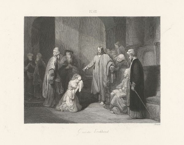 This print, "Christus en de overspelige vrouw," was created by Willem Steelink II. The composition is built upon strong tonal contrasts, moving from areas of deep shadow to zones of delicate light, creating a dramatic and intimate scene. The artist uses line and shadow to direct our attention to the emotional heart of the image, where Christ confronts the accusers of the adulterous woman. This arrangement immediately suggests a confrontation between justice and mercy. The setting is sparse, but the architectural details are rendered with a precision that anchors the scene, lending it a stage-like quality. The deliberate placement of figures and the stark use of light invite us to consider the structural power dynamics at play. Steelink has created not just an illustration but a space for ethical contemplation.