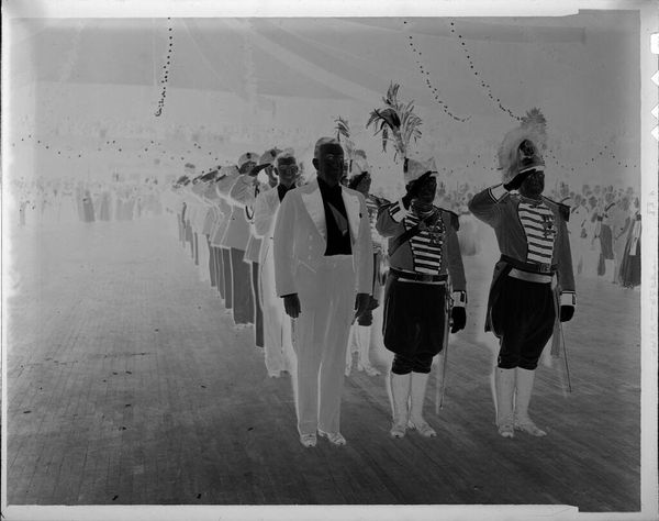 Curator: This photograph, by Martin Schweig, captures eleven male tennis players standing on a court. There is no date associated with the work, sadly. Editor: It's stark! The negative image gives them an almost spectral presence. Like ghostly athletes frozen in time. Curator: Yes, it really alters our perception. Considering the material, the photographic negative, and the labor of producing prints, it makes you consider how readily we consume such images. Is it purely documentary, or is there an inherent aesthetic at play in its creation and circulation? Editor: It's interesting to think about how the image would have been received then versus now. Group portraits like this were often about projecting a certain image of institutional strength, especially within organizations like athletic teams, and how that plays into the broader social and political landscape. Curator: Precisely, and the very act of documenting the team, the materials chosen, speaks to the perceived value and its accessibility. Editor: The ghostly effect creates a layer of visual intrigue and calls attention to the broader themes present in the photograph.