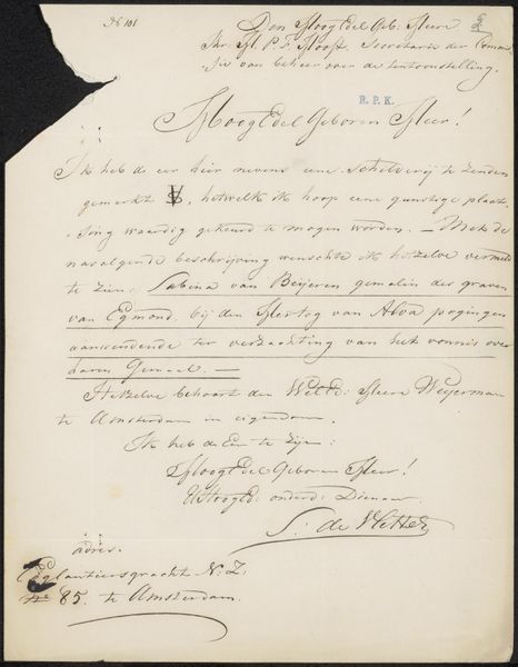 Curator: This is a fascinating piece titled "Brief aan Pieter Verloren van Themaat, secretaris van de Commissie van de Tentoonstelling van Levende Meesters in Utrecht," likely from 1866. It's a pen and ink drawing on paper by Jan Gerard Smits. Editor: It gives an impression of a flurry, all those handwritten lines pressing across the page. Curator: Exactly. Consider the script itself. The line, weight, and flow contribute to the composition, creating visual rhythm and texture. Notice the loops and flourishes, particularly in the salutation and signature. Semiotically, each stroke speaks to a cultured, learned hand. Editor: And what labor went into that hand! Imagine the sheer hours of disciplined training required for such precise, elegant penmanship. This wasn't simply writing, it was a craft. The controlled strokes suggest an attention to detail, perhaps even pride in the work itself. Curator: True, but let's not reduce it solely to its creation. It is important to recognize that Jan Gerard Smits was trying to communicate ideas, requests, or possibly an appeal, but there are specific cultural standards to this formal mode of address. Note how such conventions impose a certain structure. Editor: However, what about the materiality of ink? Where was it sourced? What kind of paper was used and how would this affect production, how much paper was affordable in that day? How did these factors inform Smits' art or letter-making decisions, considering access and labor practices. Curator: Yes, material constraints and availability would certainly be part of the overall socio-historical matrix. But to see the letter *only* through those lenses seems like an oversimplification. Editor: Perhaps, yet considering these questions invites deeper explorations of art's connections to society, inviting a fresh perspective of value that moves beyond the surface! Curator: Very well. It offers a complex vision of art history, intertwining aesthetic concerns with socio-economic context. Editor: And prompting new avenues of reflection.