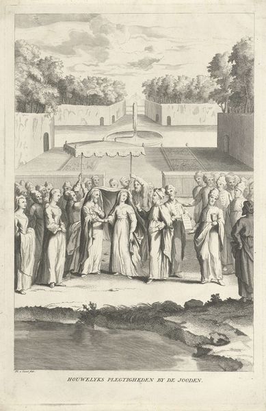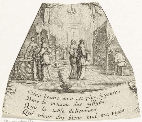 Curator: This small yet bustling etching is titled “Bedevaart,” or “Pilgrimage,” and it’s attributed to Albert Flamen, dating roughly between 1648 and 1665. It seems like a print. Editor: It gives me a distinct storybook feeling. The figures are all so deliberately placed, like actors on a tiny stage, and the varying line weights really push the drama. Curator: Indeed. Flamen was part of a generation of artists who embraced printmaking as a medium for wider dissemination of imagery. These types of genre scenes gained immense popularity during this period in the Netherlands. Printmaking allowed for greater distribution. Editor: And that popularity likely stems from a connection to common experience. Religious pilgrimages, as depicted here, would have been significant community events. I am particularly drawn to the text included at the bottom of the piece. Do you know its meaning? Curator: Yes, in a rough translation, the inscription speaks of life as a pilgrimage. Changing locations ceaselessly, journeying towards happiness by walking the path of God. It’s a fascinating inclusion, a kind of moral directive combined with a picturesque landscape. Editor: The winding road, the towering trees, and the collective procession are all heavy with symbolism. Note, also, the dog gamboling ahead, which strikes me as particularly symbolic. The animal precedes the people, hinting at both devotion and inherent earthly impulses, accompanying the soul on its quest. Curator: Interesting that you should focus on that, considering its placement in the scene. Perhaps it is representative of society; it charges forward eagerly, and in doing so guides those more dogmatic on their journey to new and greater ideas. The engraving also gives insight to social norms of the time, as pilgrimage has taken different shapes over time, varying from genuine devotional travel to what amounts to more commercial exchange with occasional prayers or rites along the way. Editor: An interesting insight! I can't help but feel this single print encompasses themes that stretch from the deeply personal to communal life and how the state manages society. Thank you. Curator: Yes, that the etching holds layers to reward repeated consideration is what I find fascinating, thank you for joining me.