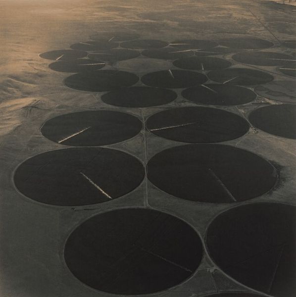 Emmet Gowin captured "Pivot Agriculture on the Snake River Plain" using gelatin silver print. The photograph presents an aerial view where circular patterns dominate the landscape. These shapes, rendered in tones of gray, create a mesmerizing rhythm across the frame. Gowin’s high vantage point flattens the space, emphasizing the abstract design over representational accuracy. This image evokes a formalist reading by highlighting the interplay between geometric shapes and tonal variations. The circles—fields cultivated through pivot irrigation—become symbols of human intervention on nature. Viewed through a structuralist lens, the photograph reveals a binary opposition: the rigid geometry of agriculture versus the uncultivated land, questioning our relationship with the environment. This also challenges traditional landscape photography. The stark contrast and circular motifs not only serve aesthetic purposes but also provoke thoughts about the ecological impact of agricultural practices. Gowin's work prompts us to consider the signs we leave on the land and how these shapes reflect our values.