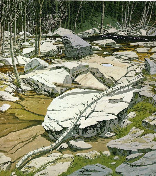 Editor: Here we have Rockwell Kent’s “Au Sable River, Winter, Adirondacks” from 1960, rendered in oil paint. There's a real stillness to this painting, a quiet that's almost haunting. What strikes you about this winter scene? Curator: That stillness you perceive is fascinating. Winter itself often stands as a symbol for dormancy, waiting, a necessary period of quietude before rebirth. Kent, having witnessed both World Wars, might be channeling that sense of collective trauma into this stark, somewhat melancholic image. What do the snow-covered rocks in the river remind you of? Editor: Icebergs, maybe? Or stepping stones... Curator: Yes, and what could stepping stones signify, metaphorically? Could they not be paths forward, tentative possibilities after periods of stagnation or hardship? The river itself could represent time, always flowing, changing the landscape, both physically and emotionally. Even the bare trees contribute; their skeletal forms against the muted sky become almost like inscriptions— a record of survival, or perhaps warnings about cycles of decline and endurance. Editor: I hadn't considered the trees that way—almost like symbolic markers. Is there significance to the specific type of tree or placement within the scene? Curator: That's a astute question. Notice the verticality of the slender trunks; they point upwards like fingers reaching toward something unseen, a plea, an aspiration. The artist might be deliberately utilizing this alignment to communicate longing, hope amidst the cold austerity of the winter scene. But also, remember Kent’s social activism: How might an untouched landscape act as a symbol of cultural resistance? Editor: So much more than just a landscape—I see resilience, the quiet strength needed to endure. Thank you! Curator: Indeed. It reminds us that visual imagery preserves not just physical space but cultural memory, connecting us to our shared emotional and historical landscapes.
