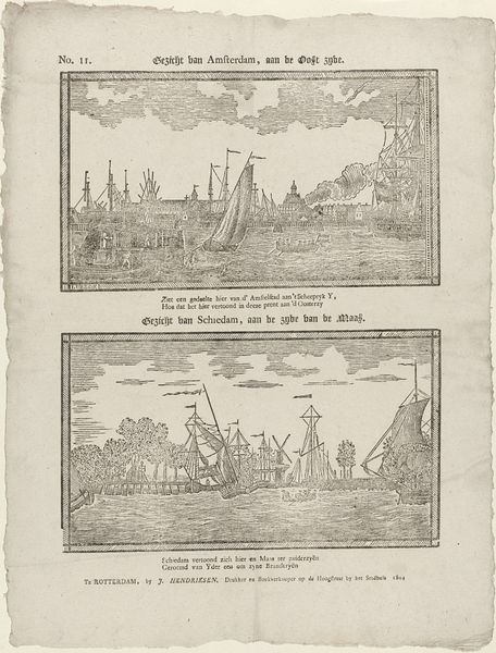 Curator: This print, "Gezigt van Rotterdam, aan de zijde van de Maas te zien / Gezigt van Delfshaven, aan de zijde van de Maas te zien", made in 1805 by Dirk van Lubeek, is a fascinating example of early 19th-century Dutch printmaking. Two cityscapes rendered in line engraving showcase Rotterdam and Delfshaven as bustling port cities. What strikes you about it? Editor: Well, the detail is impressive given it's a print. The ships seem very important, almost as if they’re characters in a play. What’s interesting to me is the text right under each image—the use of text seems an important part of this work. How should we interpret that? Curator: That’s a key observation. Think about the means of production. This isn't just art for art's sake. Engravings like these were mass-produced. The added text wasn’t merely descriptive; it served a practical function – adding an instructive element and attracting potential buyers in the marketplace. These prints become commodities circulating within a specific economy. This reflects a growing accessibility to images and information, transforming cultural consumption in the 19th century. Who had access to images like this? How were these made and sold? Those are key questions. Editor: So it's less about artistic expression and more about accessibility and commercial exchange? That feels... different from how we often approach art history. Curator: Not necessarily *less* about artistic expression, but *also* about those factors. Consider the labour involved in creating such a detailed engraving, the access to materials, the skill required and compare it to the final selling price. Editor: I never considered that aspect of printmaking from this era. Now I see the ships representing more than just transport; they embody the industry that propelled these cities. Curator: Exactly! We’re invited to consider art in the context of labor, materials, and even marketing strategies. It offers a perspective beyond pure aesthetics. Editor: It’s really opened my eyes to the socio-economic aspects that influence art production and appreciation. Thanks! Curator: My pleasure. Considering the conditions and resources of creation adds depth to any work.
