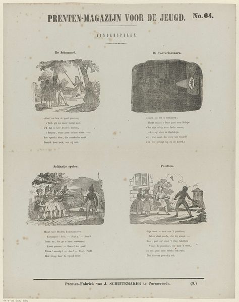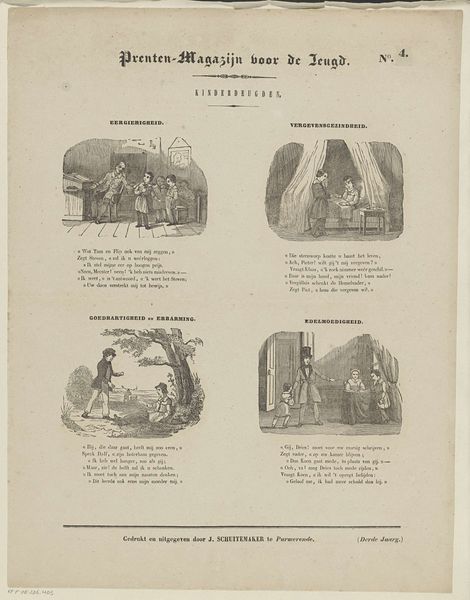 This print, "Kinderdeugden," meaning children's virtues, was made by Jan Schuitemaker, and published in Purmerende, Netherlands. This artwork seems to be a page from a children’s magazine, which visually presents ideas for good behavior. The six scenes show different virtues like obedience, helpfulness, and contentment. These aren't just random acts, but reflections of a culture emphasizing moral education. The imagery is presented in the form of small vignettes accompanied by descriptive text. Schuitemaker uses accessible scenes of everyday life: a child diligently reading, another sharing their belongings, and a third telling the truth. This connects moral instruction to the daily experiences of young people. The cultural context includes the rise of print media for children in the 19th century and the development of ideas about childhood innocence. Understanding this artwork involves looking at the history of education, children’s literature, and the broader social values of the time. Examining the archives of the publishing house would offer further insights into the creation of "Kinderdeugden".