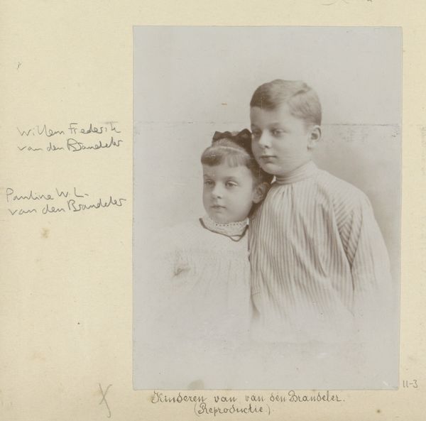 Curator: This is a gelatin-silver print by Otto Hisgen, dating roughly between 1930 and 1935. It's entitled "Portret van Tiny en Klaas Kleiterp als kind," which translates to "Portrait of Tiny and Klaas Kleiterp as Children." Editor: The first thing that strikes me is their gaze. Both children look directly at the camera, almost accusingly. It lends a solemn, almost haunted quality to what is otherwise a fairly straightforward portrait. Curator: Agreed. The realism is quite arresting. I find it interesting that Hisgen chose to depict them within this oval format, a common convention of portraiture in photography meant to evoke fine art traditions, particularly paintings of previous centuries. Editor: Absolutely. And the symmetry is carefully constructed. Their outfits are very similar and plain; drawing attention to their faces, where we seek information about who they are. Those unsmiling, rather fixed expressions, amplify this sense of solemnity and the passage of time frozen within the image. Curator: The austere depiction may reflect the social context of the interwar period. In the Netherlands, economic hardship and political instability fostered a culture of reserve, mirrored perhaps in this deliberate lack of flamboyance. The studio setting, in itself, lent an air of formality to the entire occasion. Editor: It makes one wonder what stories these young faces could tell. The simple medallion worn by the girl – a potential symbol of innocence or faith - the somewhat severe haircut of the boy – suggesting adherence to societal norms of masculine presentation…all these small details coalesce. They whisper stories of cultural ideals and personal aspirations frozen in time. Curator: And while the individuals might be obscure to us now, the photograph remains a compelling artifact reflecting not just their likeness but the larger societal frameworks that shaped their world and identity. It becomes, in essence, a public document as much as it is a personal one. Editor: A fascinating reminder of the power held by these simple-seeming photographic objects, these windows onto forgotten moments and evolving symbolisms of childhood and identity.