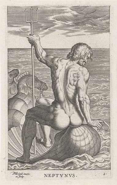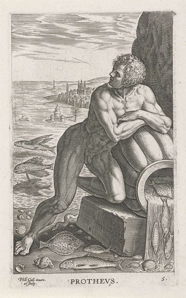 Philips Galle created this engraving, "Riviergod Danubius," around the late 16th century. The eye is immediately drawn to the figure's back, sculpted with a network of lines that articulate each muscle and sinew. This emphasis on anatomical detail is a hallmark of Renaissance art. Consider the composition: Danubius is seated, yet his posture conveys a sense of dynamic movement, twisting away from us, with his gaze directed elsewhere. The staff in his hand, and the river landscape behind him, act as semiotic markers, identifying him as a river deity. His unusual head adornment, like sprouting reeds, further reinforces this symbolism, blurring the boundary between the human form and the natural world. The engraving’s formal arrangement is not merely descriptive. Instead, Galle uses the play of light and shadow to suggest depth and volume on a flat surface. This attention to form and structure echoes philosophical concerns about representation and perception, revealing how artists grappled with the challenge of capturing three-dimensional reality in two dimensions.