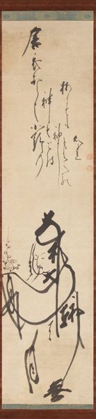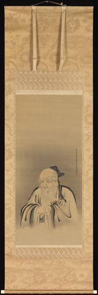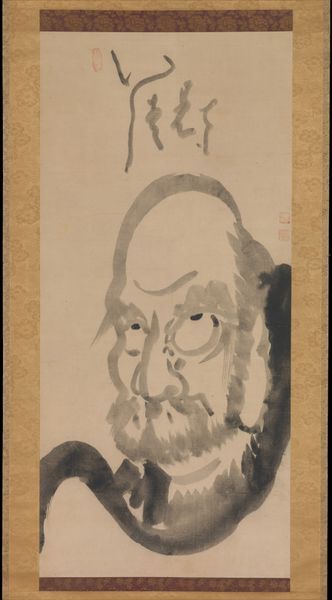 Editor: This is Unkoku Tōgan’s *Portrait of Daruma*, dating to the early 17th century, done with ink on toned paper. I’m immediately struck by the simple, almost austere rendering, and the incredible detail given to Daruma's face. What historical perspectives can you share on how this piece reflects its time? Curator: Well, the patronage of Zen Buddhism by the warrior class had a massive impact, making icons like Daruma incredibly popular. Consider how this piece might function not just as a devotional object but also as a symbol of cultural aspiration and control? What does Daruma *mean* to a Samurai audience? Editor: So, more about societal aspiration than religious observation alone, interesting. Is the prominence of such portraits, beyond personal altars, influencing society at large? Curator: Absolutely. Think of the scroll format itself; these are often displayed in specific contexts and gatherings, shaping conversations and reinforcing social hierarchies. This portrait helps craft an idea of the self in society and the values worth preserving through its public role. How do the choices Tōgan made reflect those social values? Editor: So, his stern, almost stoic, face… almost promotes self-discipline as civic virtue. This isn’t just devotion; it’s a kind of performance of cultural values. Curator: Precisely! The portrait's reception within specific cultural spaces actively shapes the understanding and deployment of those values. Editor: This totally changes my view. I came thinking individual contemplation; now I see a social performance! Thanks. Curator: A shift in perspective is key. The true richness lies in understanding artwork's connection to its culture.