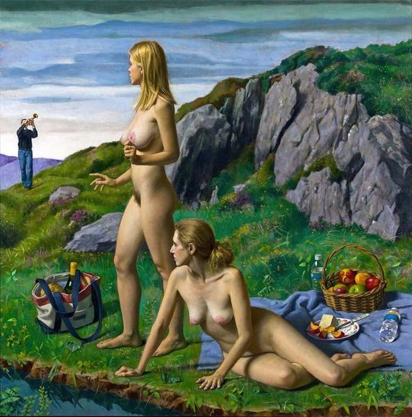 Editor: "Guten Tag," a 1981 oil painting by Siegfried Zademack. It's quite striking, almost unsettling. The figures trapped in what appears to be a cage, the stark nudity, the blindfolds... It evokes a sense of imprisonment and obscured communication. What do you make of it? Curator: It plunges us right into a rather bizarre dream, doesn’t it? Zademack offers up a world thick with symbolism. It’s as though we're peering into the subconscious. Consider the title itself, "Good Day," tinged with irony given the rather… unfortunate predicament of these two figures. And the cage… are they trapped, or is it a constructed space of their own making? Think of it as a metaphor for the self-imposed prisons we often find ourselves in, particularly in relationships. Perhaps Zademack suggests societal expectations, even love, can become a gilded cage. What do you think of their positioning within the frame? Editor: It's almost like they're mirroring each other, yet there's no real connection. Curator: Precisely. There's a distance despite the shared space. That, to me, speaks volumes about the artist's intention. But what of those blindfolds? Do they signify a willful ignorance, a refusal to see each other, or perhaps the burdens that society, relationship norms, even internal projections put between us? What do you suppose the locks and weights signify? Are they being weighed down, perhaps from making a choice between staying locked in, or setting each other free? Editor: It's definitely a lot to unpack, it kind of shifts between feeling disturbing and thought-provoking. Curator: Isn’t it though? That’s the joy, I think, of a really compelling artwork: the layers upon layers waiting to be discovered. Editor: Definitely! I'll never look at a greeting the same way.